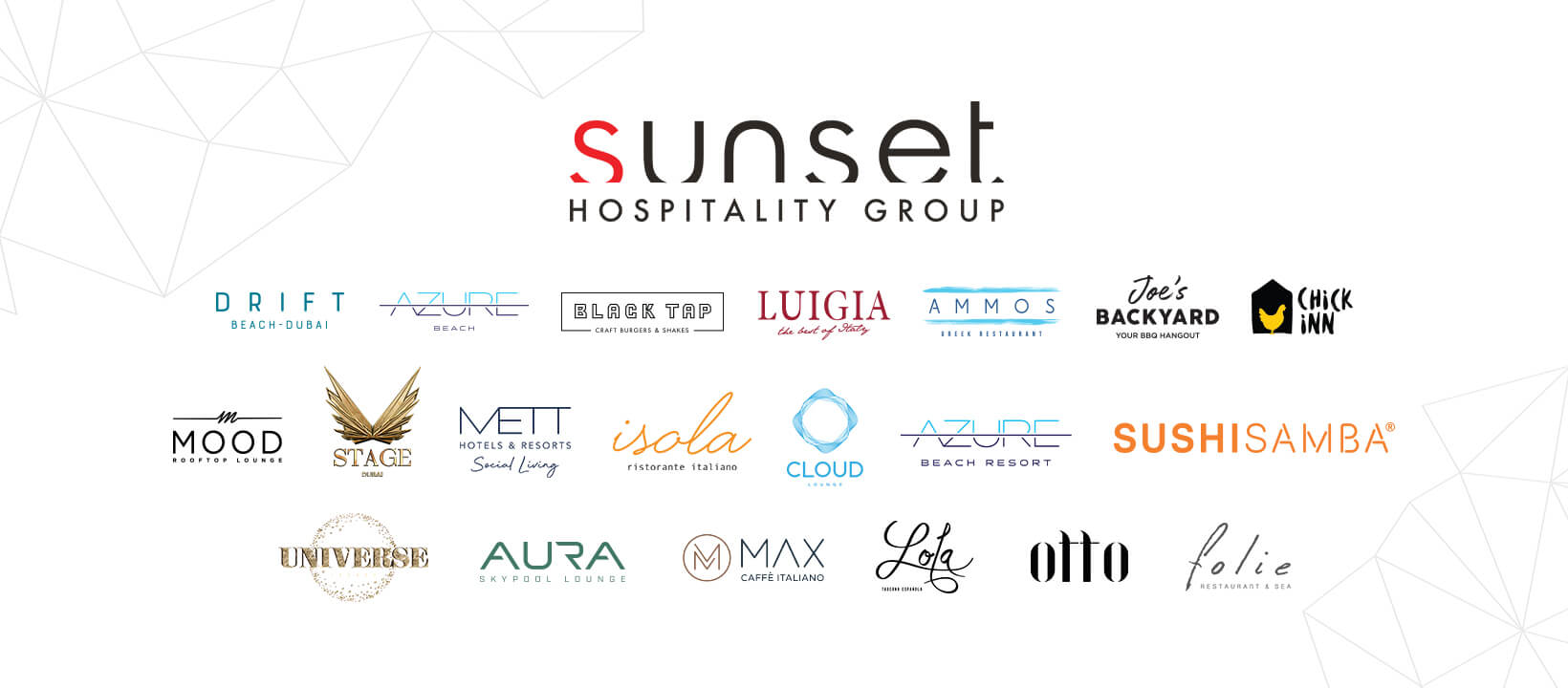 Sunset Hospitality Group is a global hospitality company known for creating unique lifestyle experiences across dining, nightlife, and hotels. Founded in 2011 and headquartered in Dubai, the group operates an extensive portfolio of restaurants, beach clubs, lounges, and hotels in key international destinations. Their brands include popular names like SushiSamba, Aura Skypool, Dream, and Azure Beach. Sunset Hospitality focuses on blending innovative concepts with high-quality service to deliver memorable guest experiences. With a growing presence across Europe, the Middle East, and Asia, the company continues to expand its footprint and redefine modern hospitality through creativity and excellence.